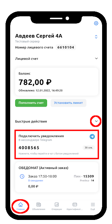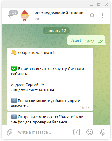 После запуска бота чат будет автоматически привязан к аккаунту Личного кабинета. Также, можно действовать согласно инструкциям бота, чтобы просмотреть баланс или воспользоваться некоторыми полезными ссылками.