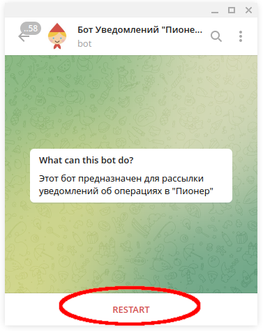 Для запуска бота требуется нажать на кнопку "RESTART" (или "START") внизу экрана.