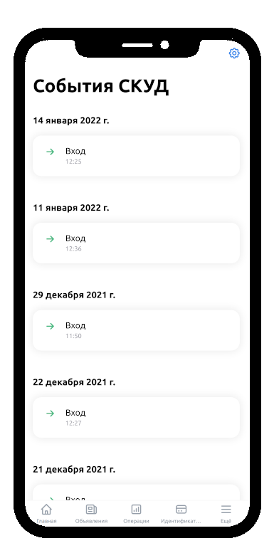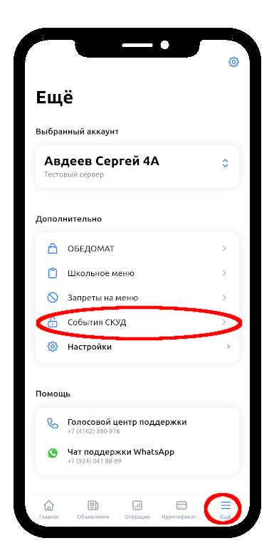 Для просмотра статистики прохода через турникет перейдите на вкладку "Ещё", расположенную на нижней панели навигации, затем — в раздел "Дополнительно" и выберите пункт "События СКУД", после чего откроется новая страница со списком совершённых событий.