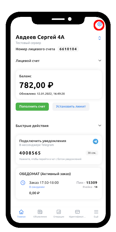 - Из любой страницы приложения следует нажать на кнопку настроек вверху экрана: изображение
